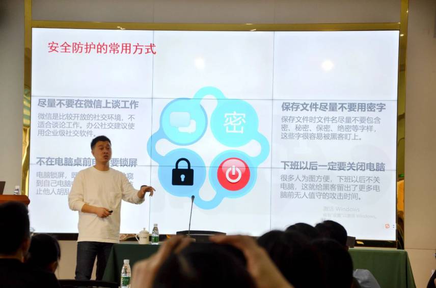 培訓內容主要圍繞信息安全的基礎知識、忽視信息安全的威脅與危害、網絡攻擊的手段與路徑以及我們應該怎么防護等主題等內容展開。老師通過眾多知名企業的重大信息泄露事件,以及國家出臺網絡安全法的層面,講授了個人數據保護的重要性和現今信息安全保護的嚴峻形勢;隨后對日常工作中的信息安全防護做了簡要介紹,如勒索軟件、弱密碼、辦公區安全、殺毒軟件等,演示了一些富有創意的復雜密碼和突破嚴密防護辦公區的簡單手段;最后對大家生活中容易忽視的個人信息安全做了提醒,如互聯網社交平臺信息、移動介質的保護。通過工作和生活上的典型案例,深刻詮釋了“安全即意識”的理念,告誡大家要養成保護信息安全的好習慣。