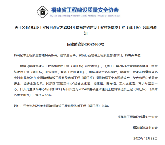 近日,福建省工程建設質量安全協會公布2024年度省級優質工程(閩江杯)名單,承建的“馬鑾灣地鐵社區二期(地下室及上部主體)”、“漳州2021P15地塊1#~14#樓及地下室(建發·養云)”成功入選。 此次獲獎,不僅是對公司在工程質量、技術實力方面的充分肯定,也體現了我司在公司建設的專業能力和社會擔當。
