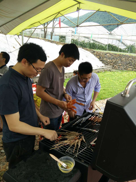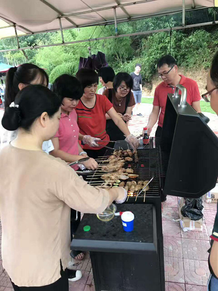傍晚時分,我們來到燒烤區,大家分工合作,洗菜的,燒火的,竹簽插蔬菜的,大家忙得不亦樂乎,不大一會兒,燒烤場中炊煙裊裊,還沒等火生好,大伙兒已經迫不及待地圍坐在爐邊,把早已串好的食物放到爐上,霎間整個燒烤場飄逸著肉的香味。大家吃著自己親手烤出的各種食品,聊著自己在工作和生活中遇到的各種趣事,其樂融融!孩子們追逐嬉鬧的歡快身影和甜美的童音感染了大家,歡聲笑語縈繞在南山谷的上空……